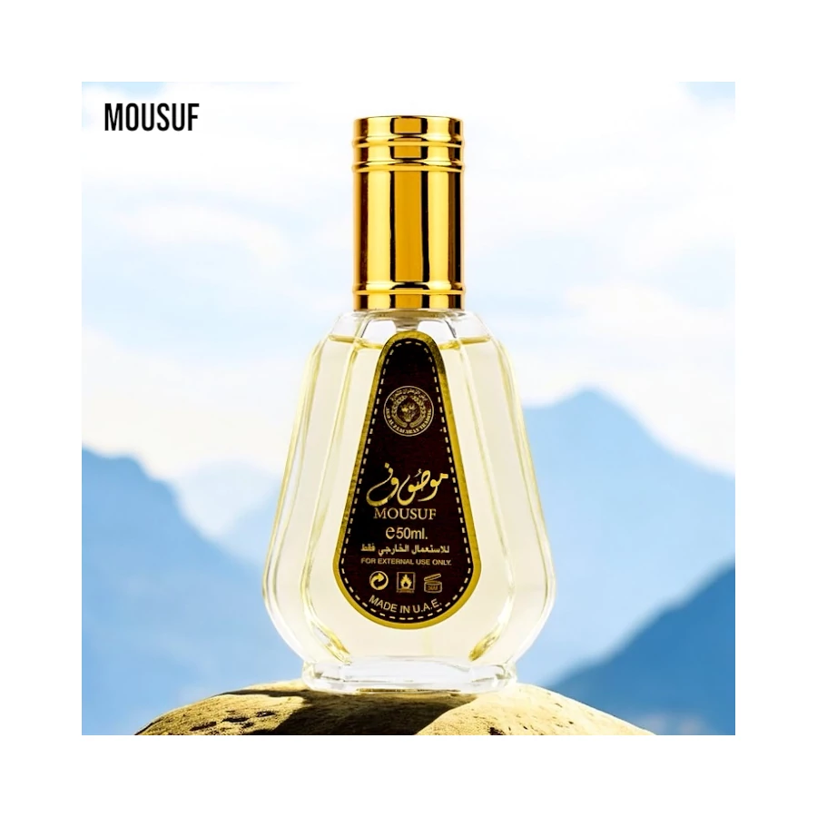 Az Ard Al Zaafaran Mousuf egy férfi illat. A fejjegyek a szőlő és a csokoládé; középső hangok a Musk és az Oud; alapjegyek a karamell és a virágjegyek.